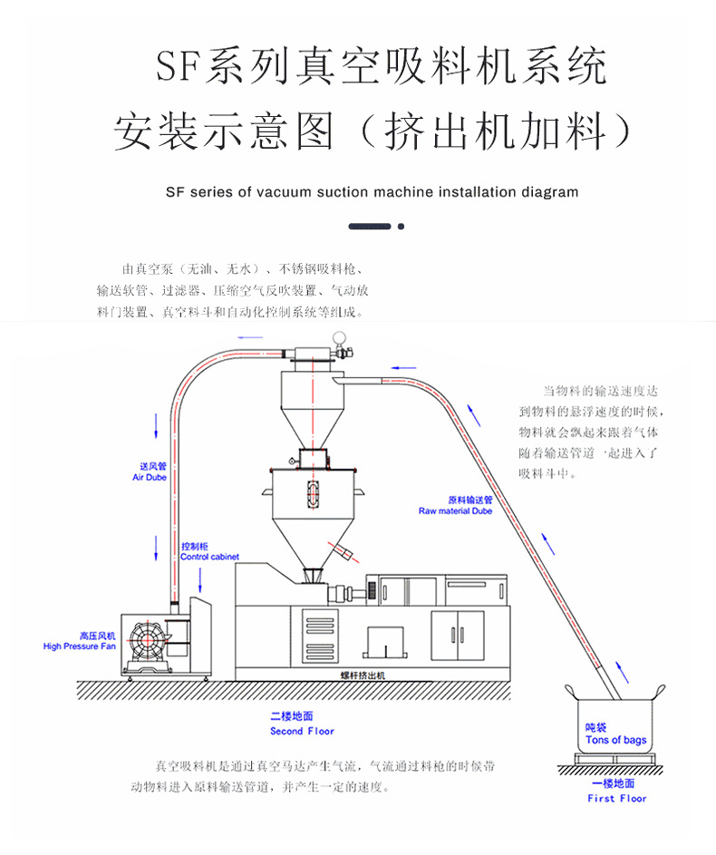 三:真空上料機(jī)與反應(yīng)釜、注塑機(jī)、擠出機(jī)、球磨機(jī)、包裝機(jī)、粉碎機(jī)、混合機(jī)、料倉等一系列設(shè)備配套。